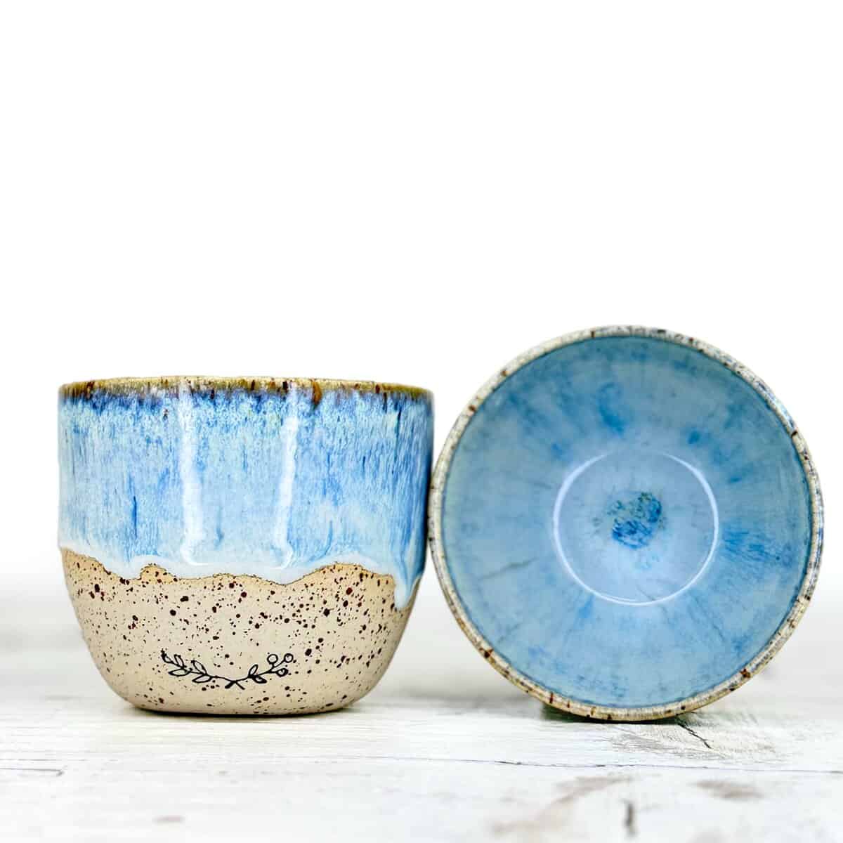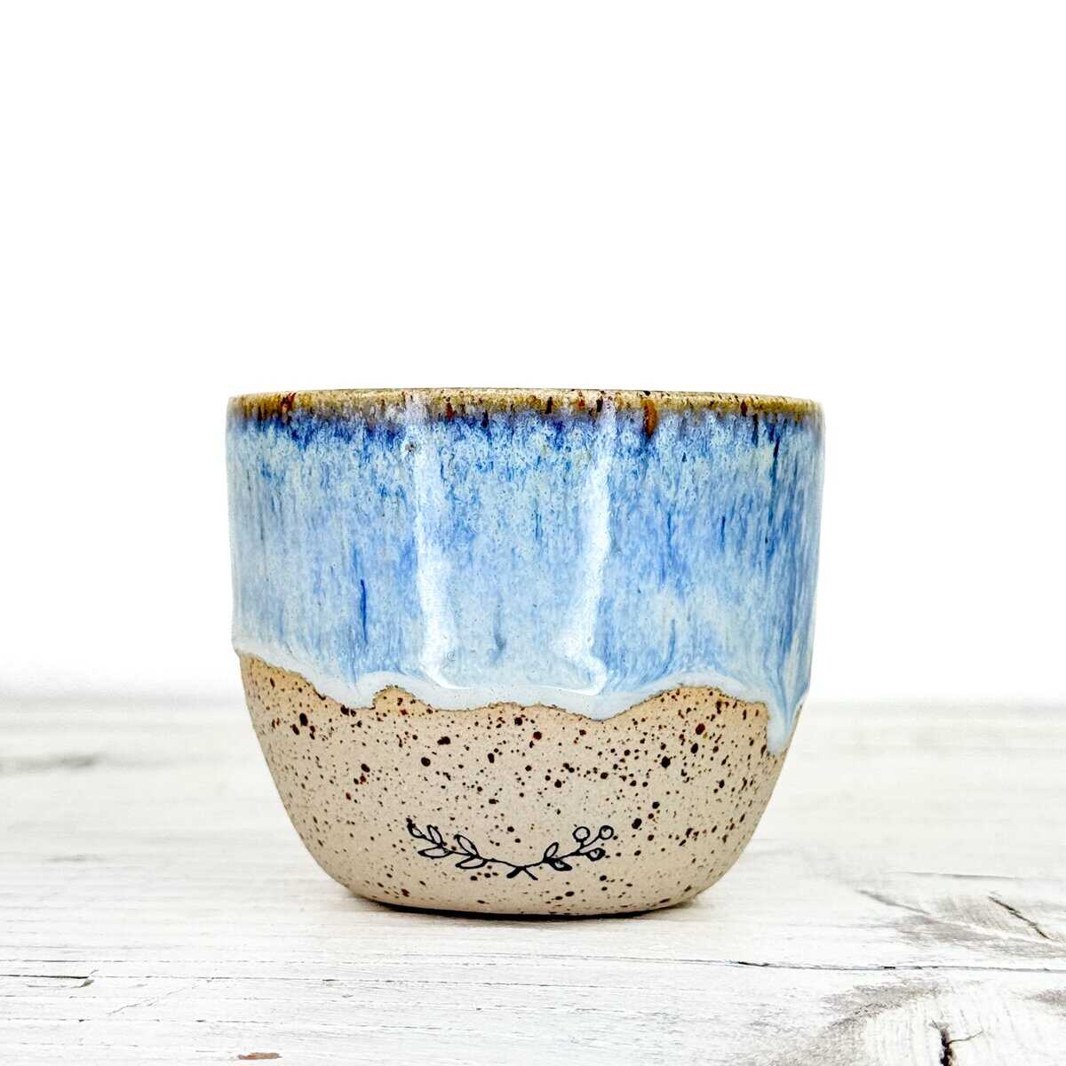 Tento kalíšek je ručně vytočen na hrnčířském kruhu z kvalitní pigmentované kameniny a následně vypálen při vysokých teplotách v elektrické peci. Jemné odchylky v objemu, měřeném až po plný okraj, slouží jako orientační hodnota.