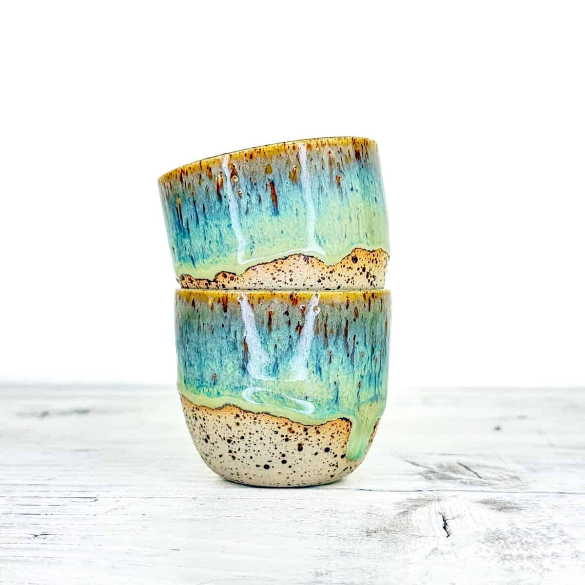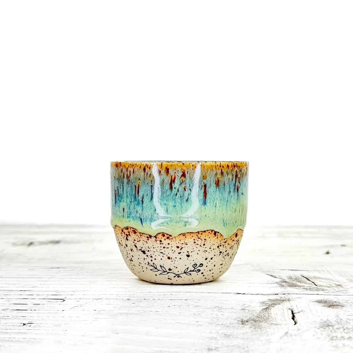 Tento kalíšek je ručně vytočen na hrnčířském kruhu z kvalitní pigmentované kameniny a následně vypálen při vysokých teplotách v elektrické peci. Jemné odchylky v objemu, měřeném až po plný okraj, slouží jako orientační hodnota.