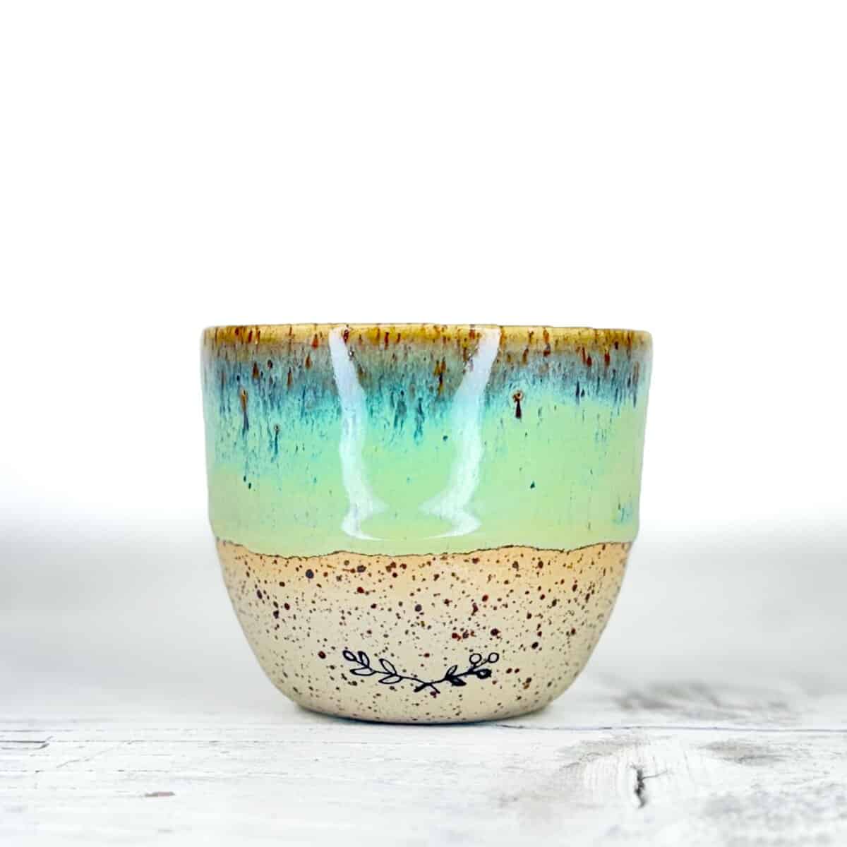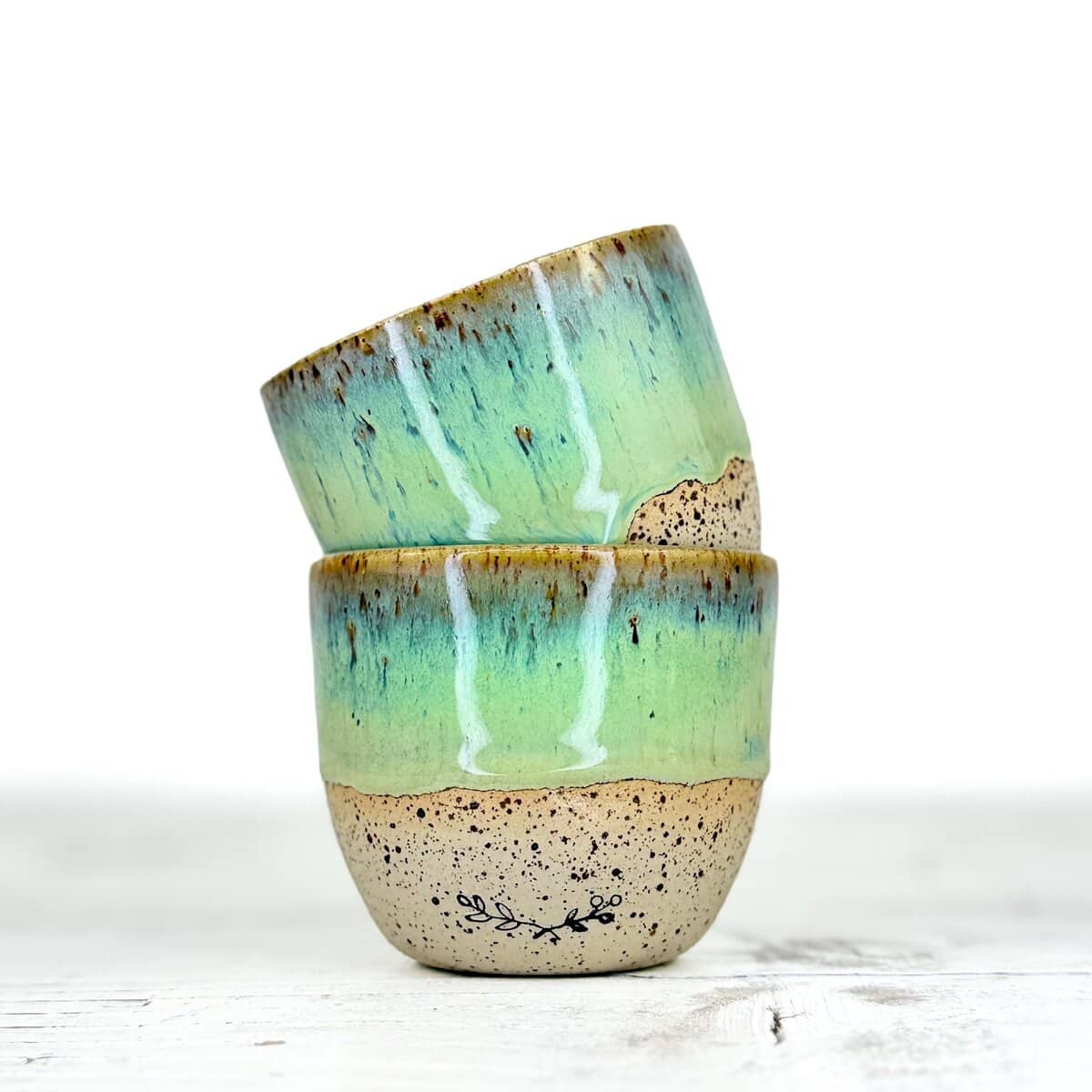 Tento kalíšek je ručně vytočen na hrnčířském kruhu z kvalitní pigmentované kameniny a následně vypálen při vysokých teplotách v elektrické peci. Jemné odchylky v objemu, měřeném až po plný okraj, slouží jako orientační hodnota.