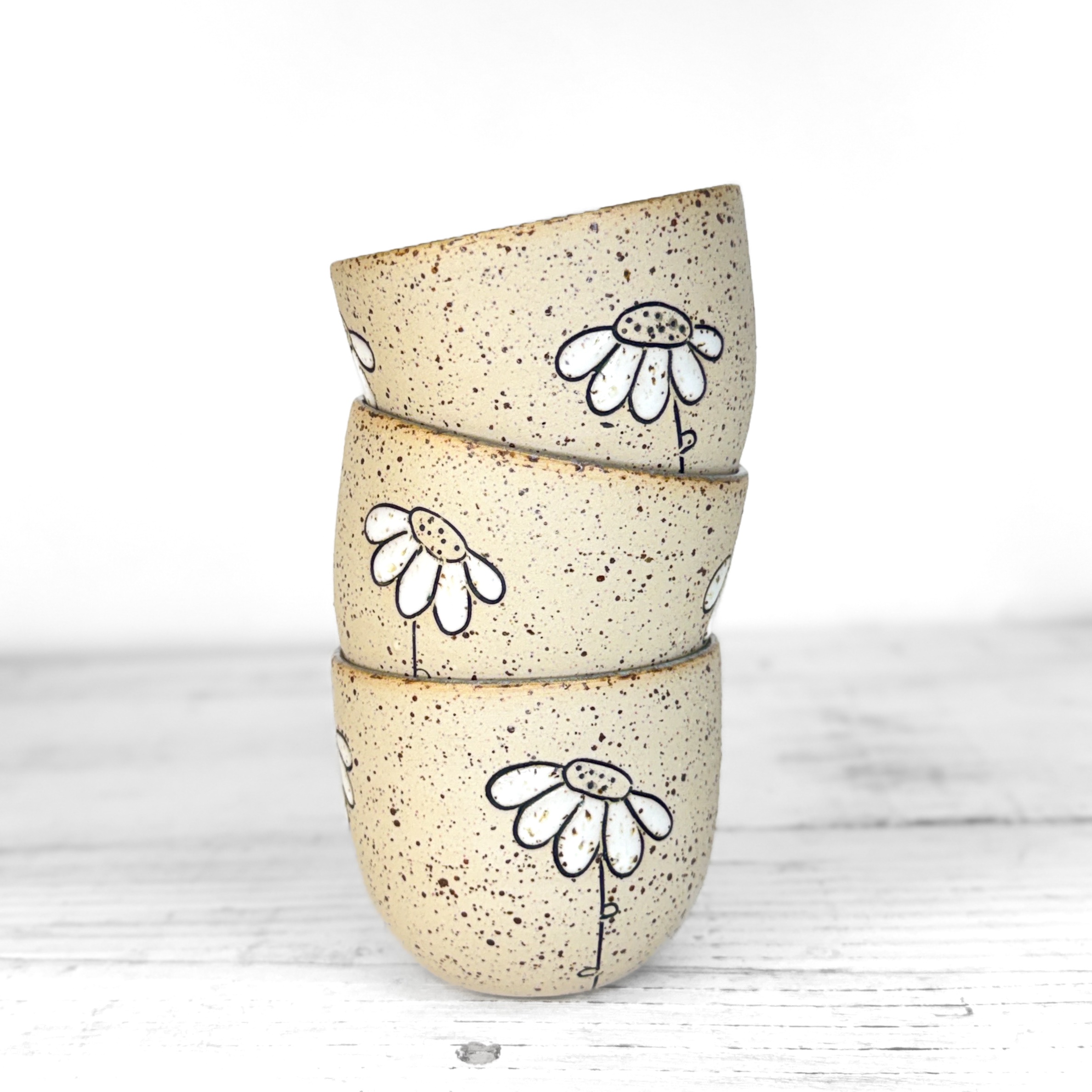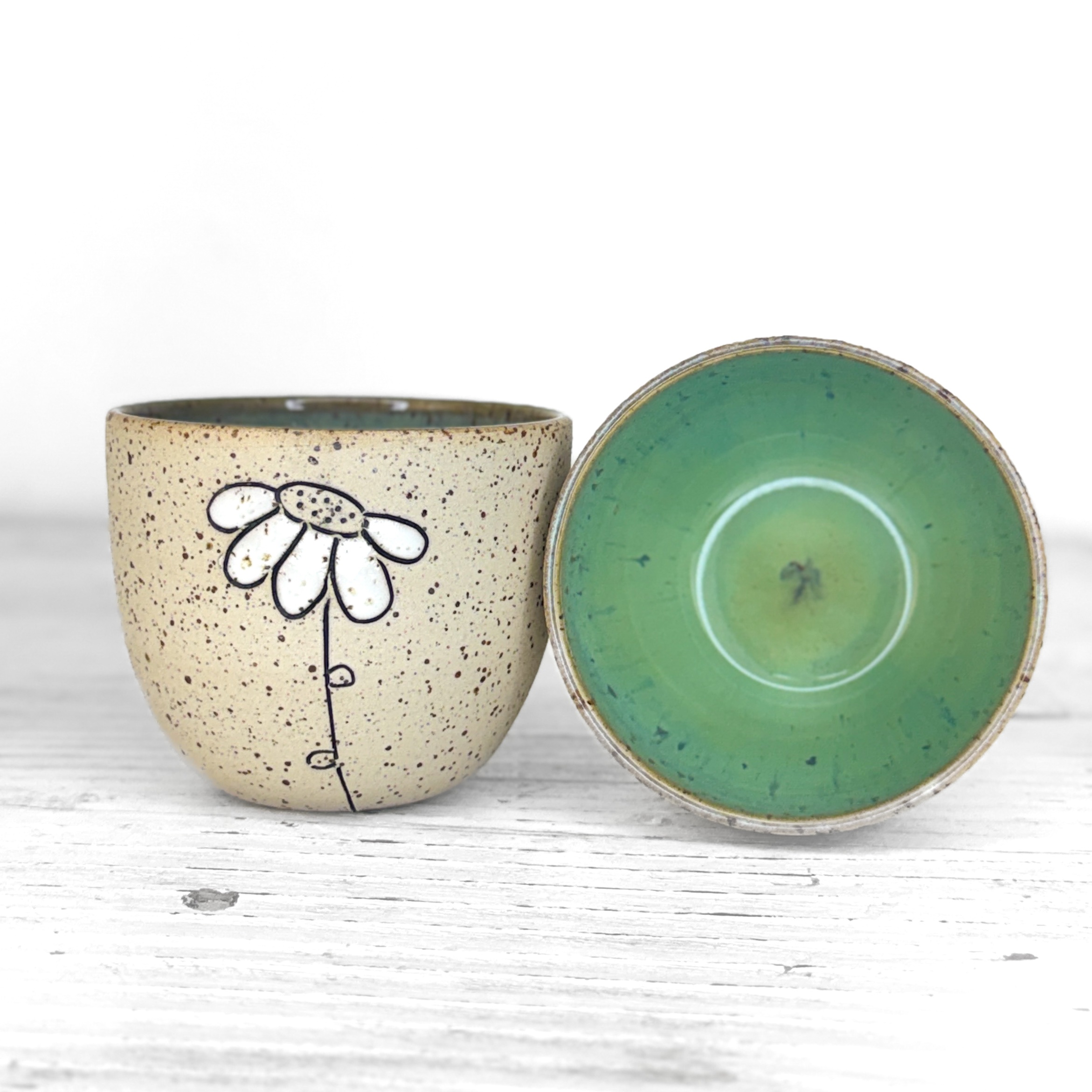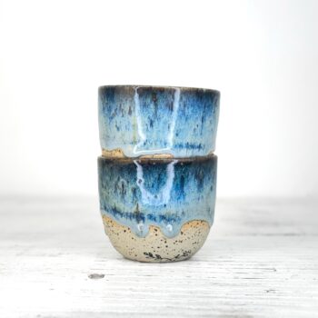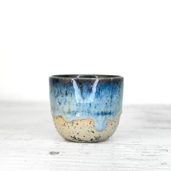 Tento kalíšek je ručně vytočený na hrnčířském kruhu z pigmentované kameniny a vypalovaný při vysokých teplotách v elektrické peci. Jemné odchylky v tvaru a rozměrech jsou přirozeným výsledkem ruční výroby.