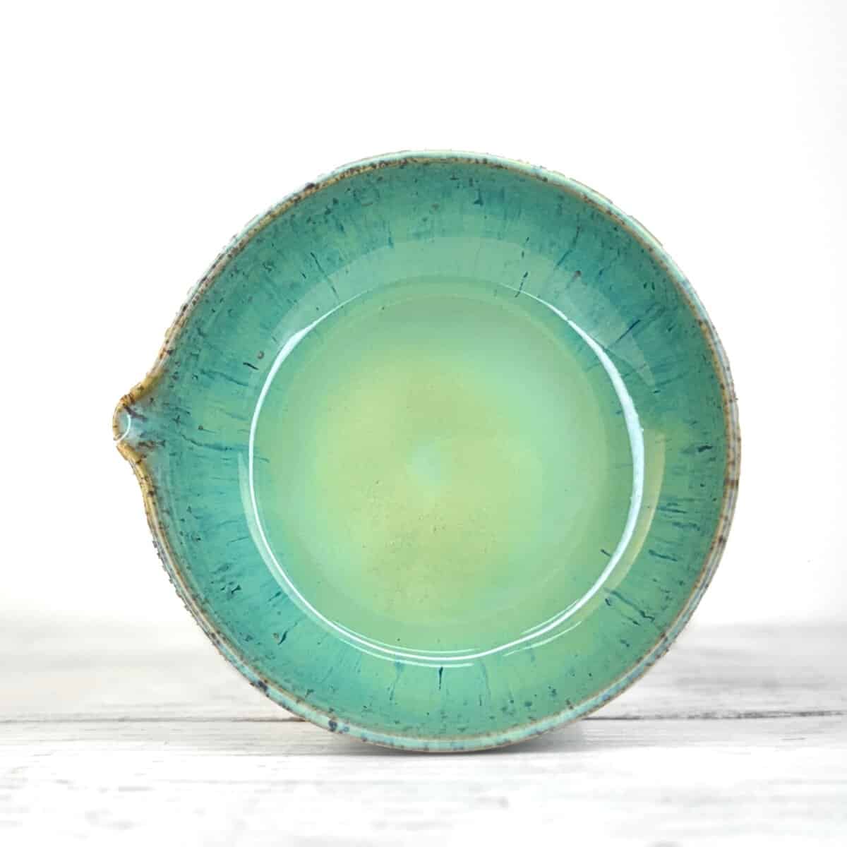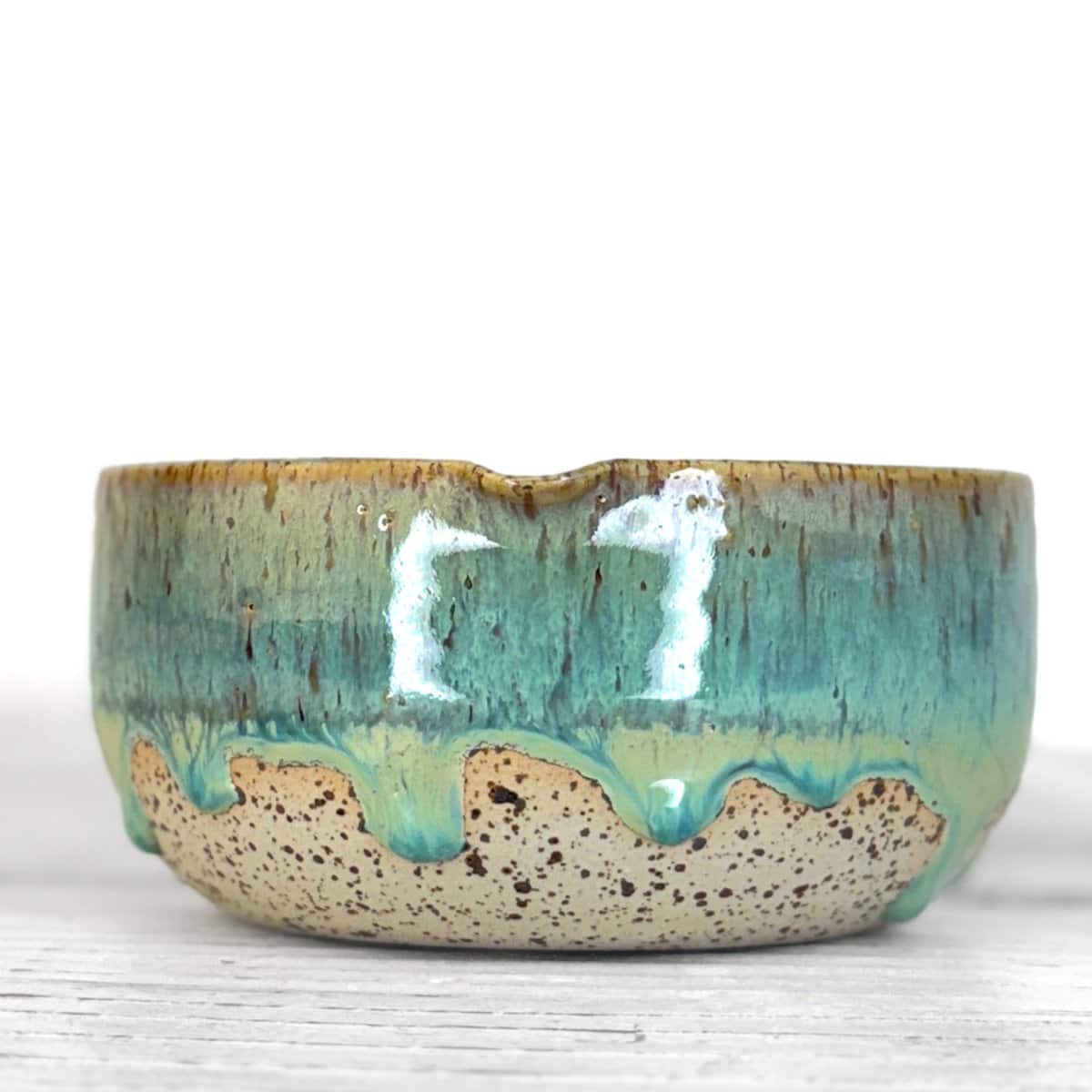 Povrch misky tvoří stékaná glazura, která se při výpalu pokaždé chová trochu jinak. Někdy vytváří výraznější stopy, jindy jemnější přechody. Tyto rozdíly nejsou vadou, ale přirozeným výsledkem ruční práce a dělají z každé misky originál.