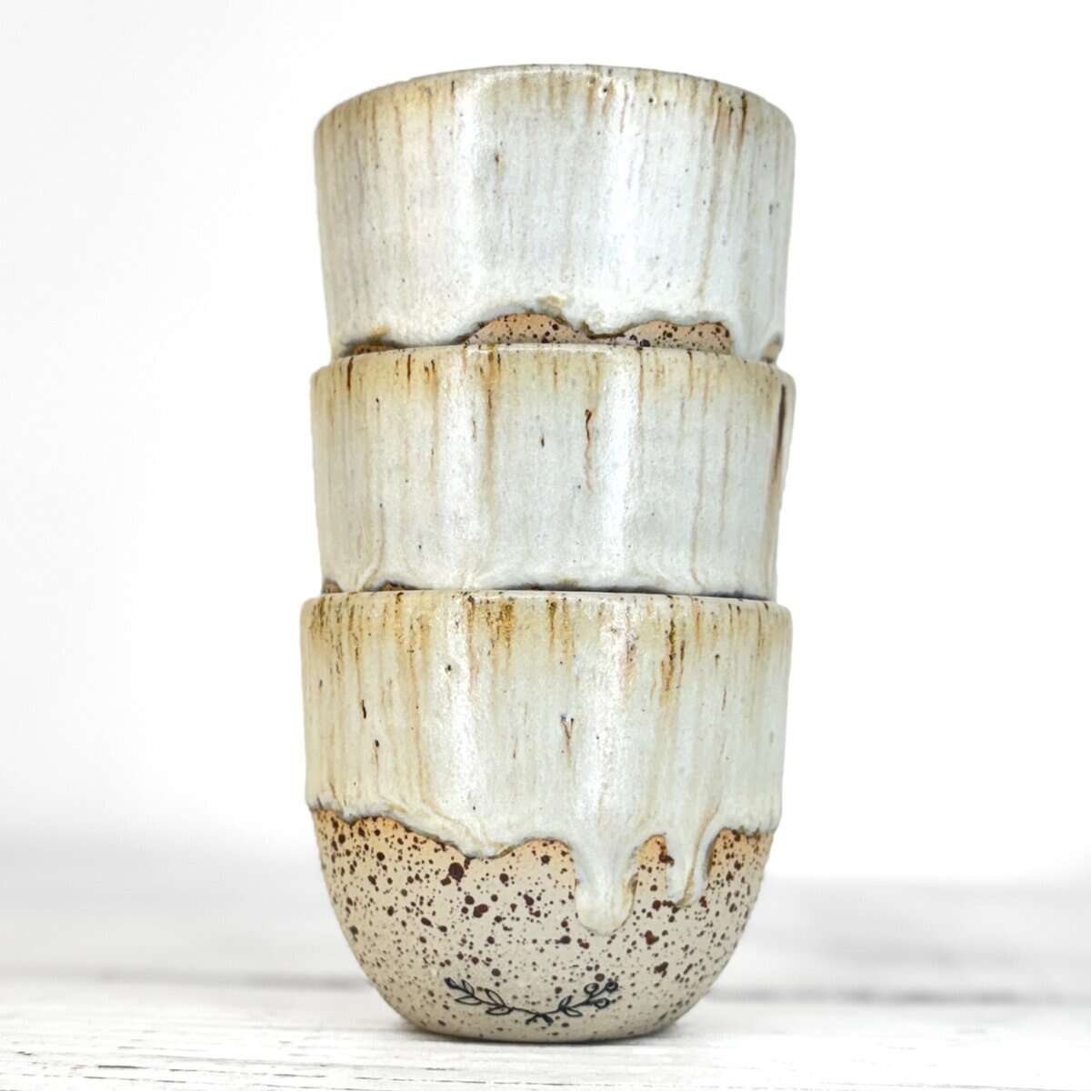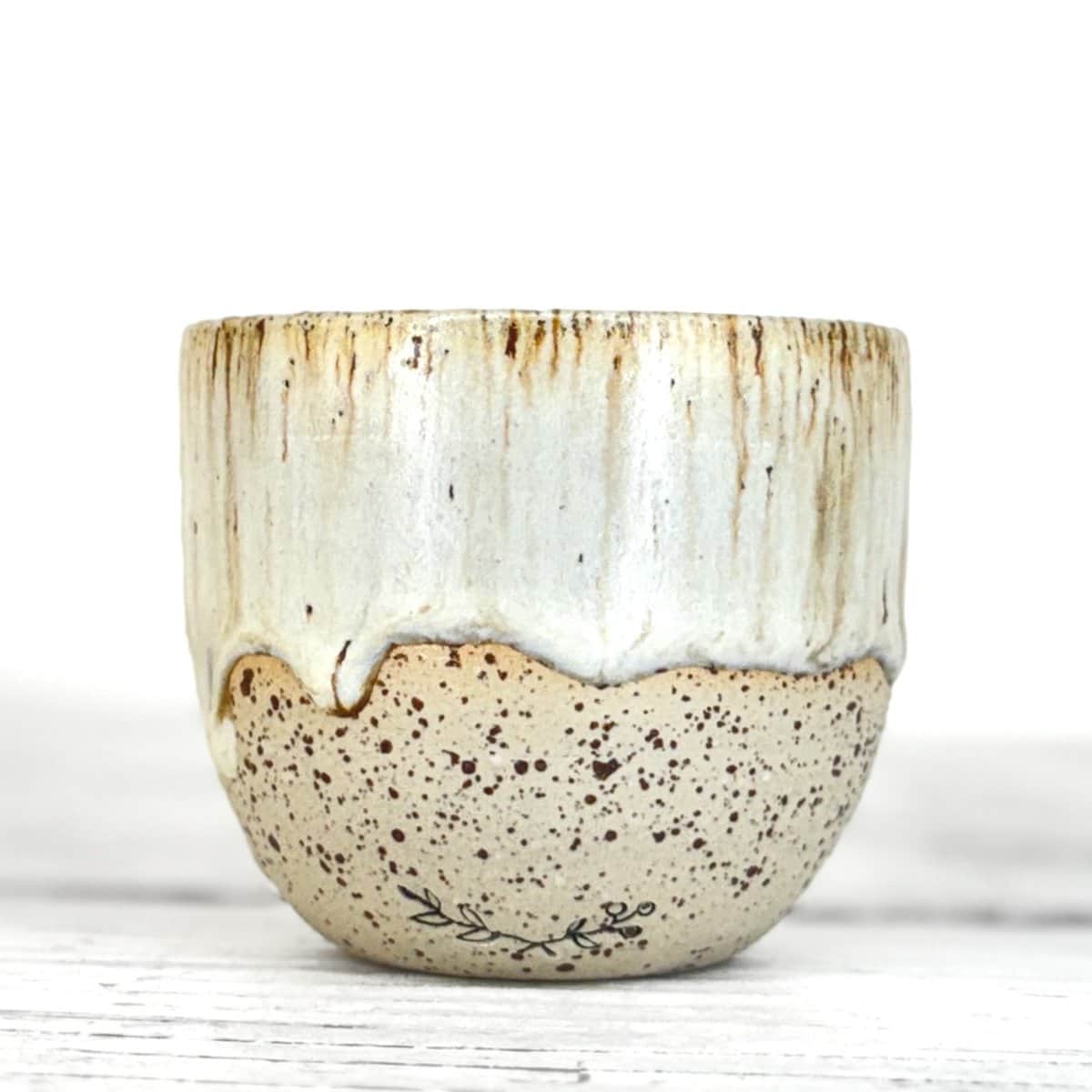 Tento kalíšek je ručně vytočený na hrnčířském kruhu z pigmentované kameniny a vypálený při vysokých teplotách v elektrické peci. Každý kus vzniká samostatně, bez forem a bez snahy o naprostou shodu. Drobné rozdíly v tvaru, tloušťce i povrchu jsou přirozenou součástí ruční práce.