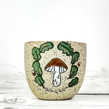 Tento kalíšek je ručně vytočen na hrnčířském kruhu z kvalitní pigmentované kameniny a následně vypálen při vysokých teplotách v elektrické peci. Jemné odchylky v objemu, měřeném až po plný okraj, slouží jako orientační hodnota.
