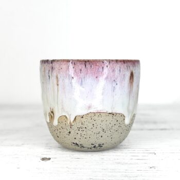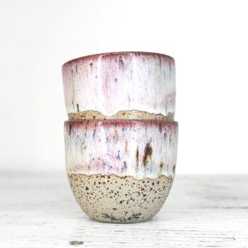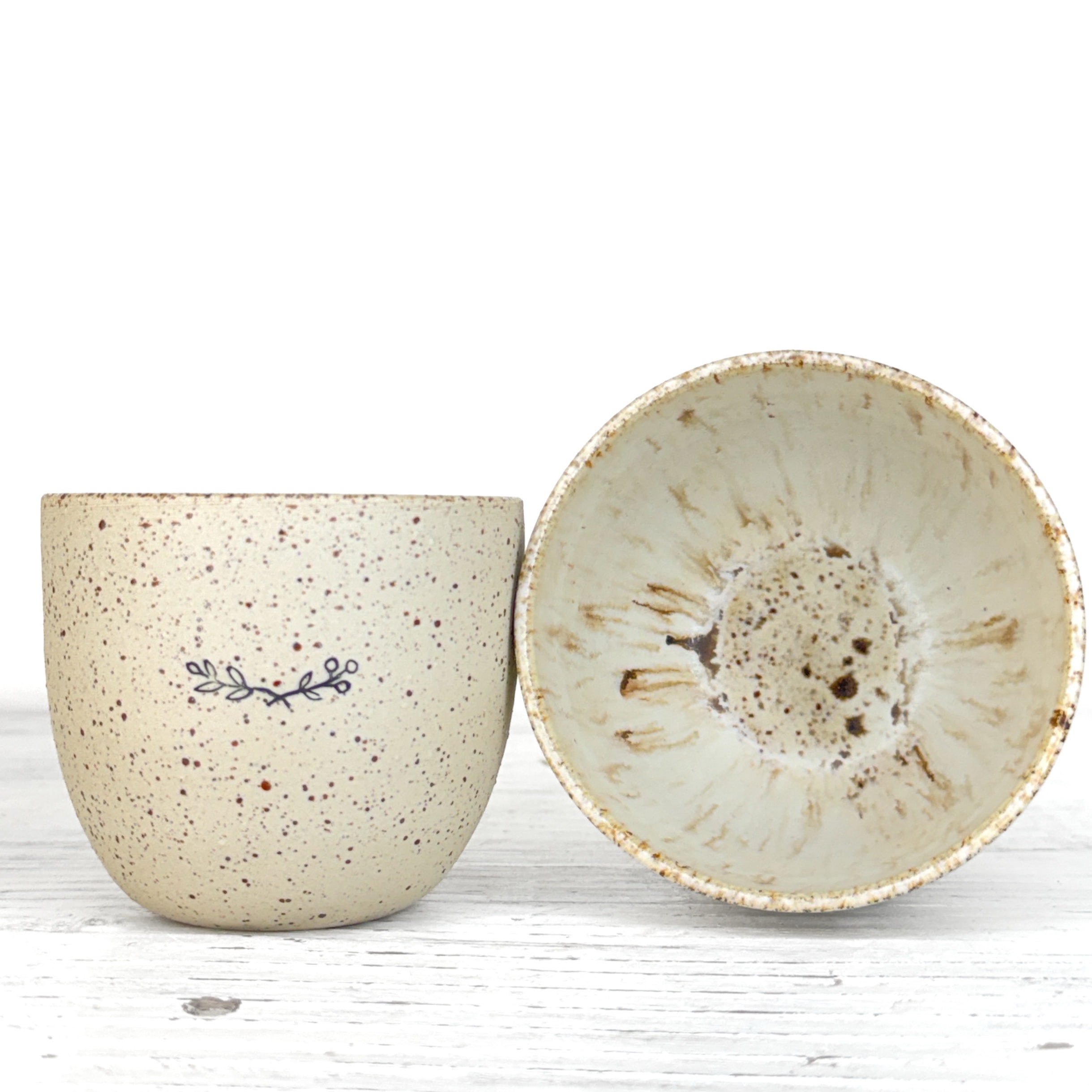 Tento kalíšek je ručně vytočený na hrnčířském kruhu z pigmentované kameniny a vypálený při vysokých teplotách v elektrické peci. Každý kus vzniká samostatně, bez forem a bez snahy o naprostou shodu. Drobné rozdíly v tvaru, tloušťce i povrchu jsou přirozenou součástí ruční práce.