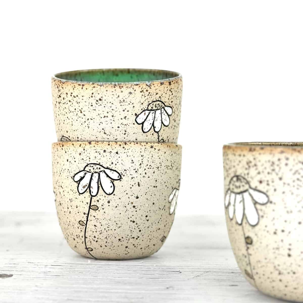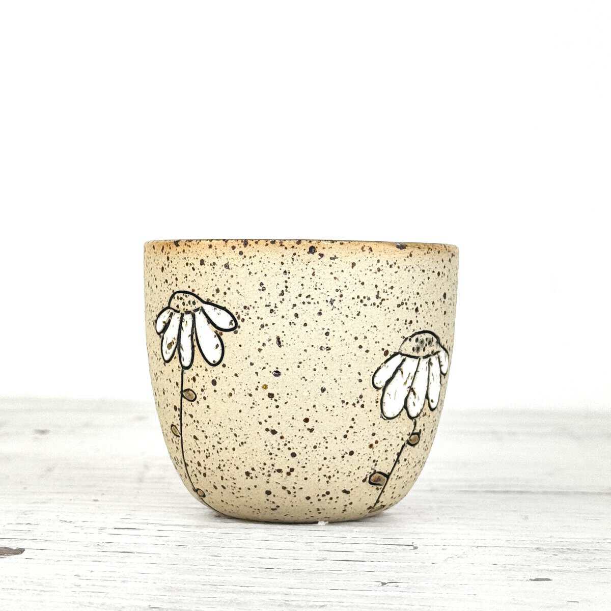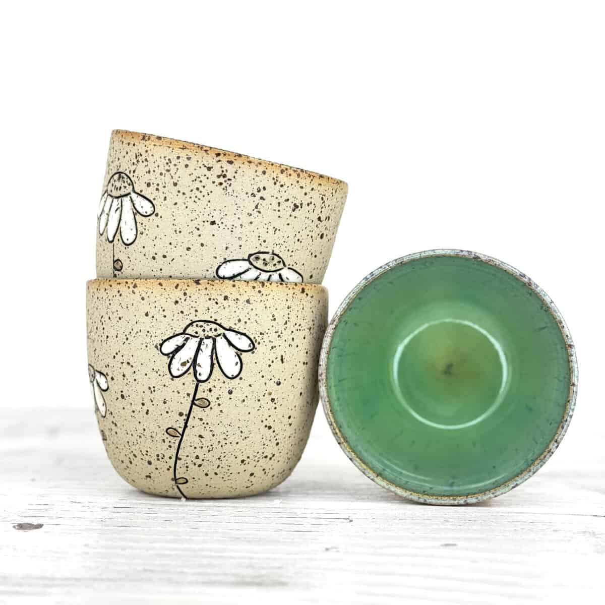 Tento kalíšek je ručně vytočen na hrnčířském kruhu z kvalitní pigmentované kameniny a následně vypálen při vysokých teplotách v elektrické peci. Jemné odchylky v objemu, měřeném až po plný okraj, slouží jako orientační hodnota.
