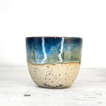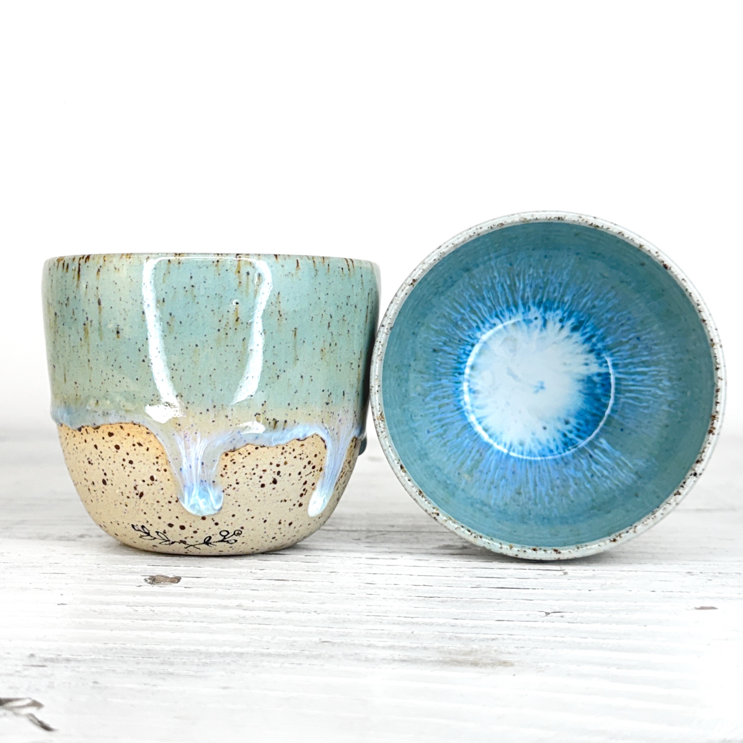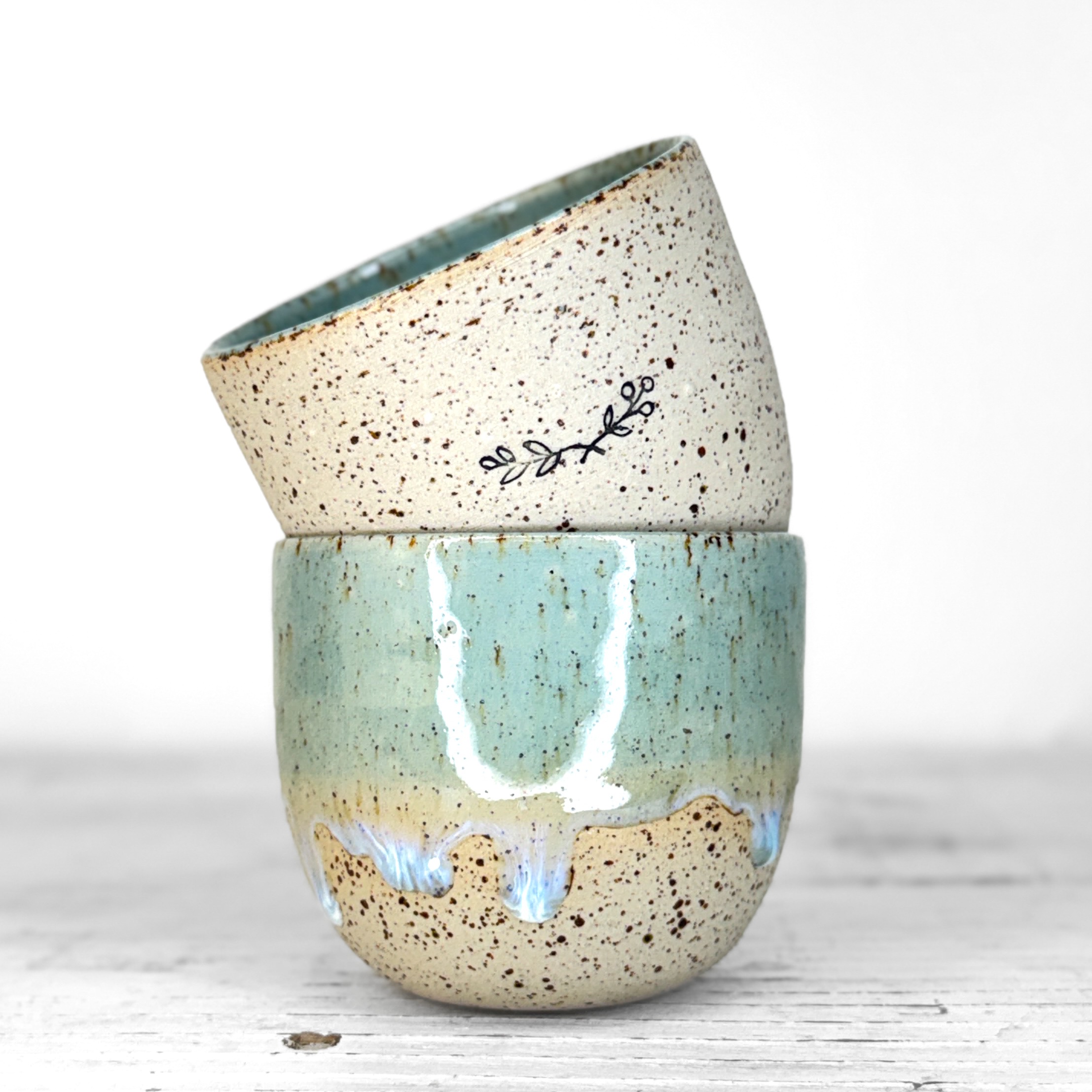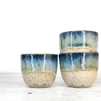 Tento kalíšek je ručně vytočený na hrnčířském kruhu z pigmentované kameniny a vypálený při vysokých teplotách v elektrické peci. Každý kus vzniká samostatně, bez forem a bez snahy o naprostou shodu. Drobné rozdíly v tvaru, tloušťce i povrchu jsou přirozenou součástí ruční práce.