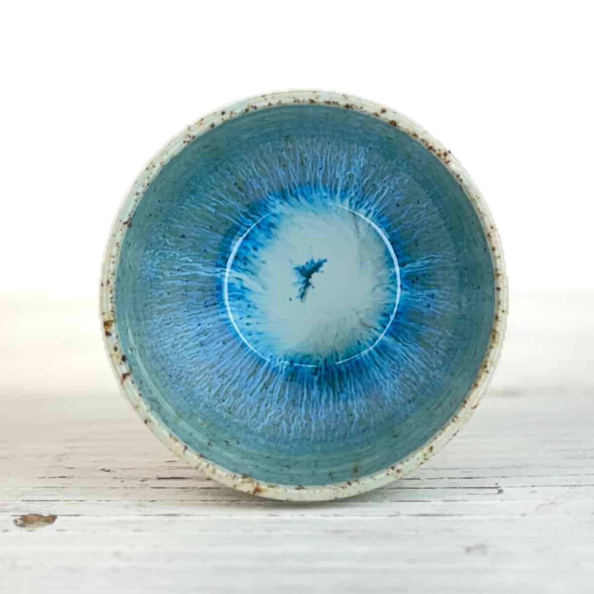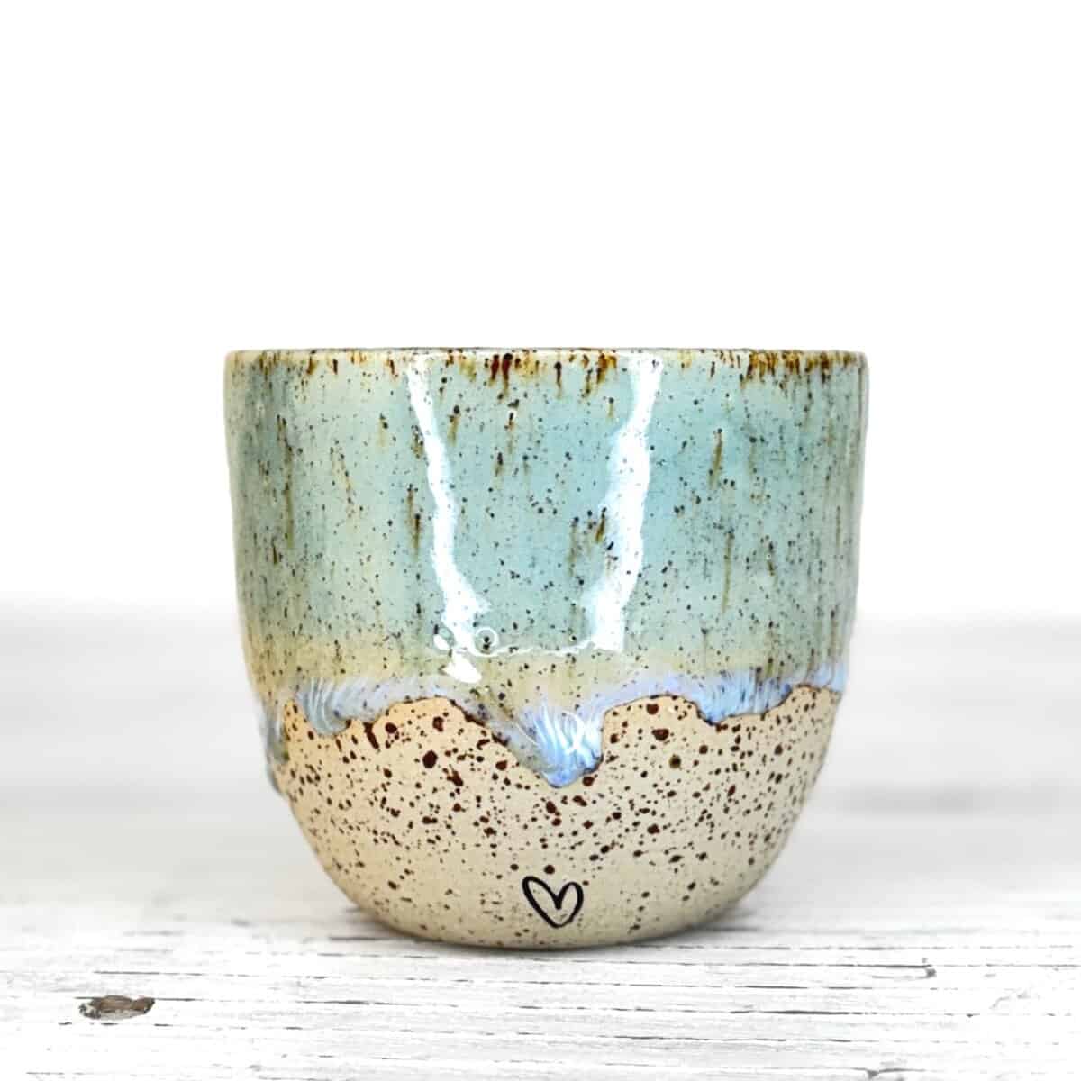 Tento kalíšek je ručně vytočený na hrnčířském kruhu z pigmentované kameniny a vypálený při vysokých teplotách v elektrické peci. Každý kus vzniká samostatně, bez forem a bez snahy o naprostou shodu. Drobné rozdíly v tvaru, tloušťce i povrchu jsou přirozenou součástí ruční práce.