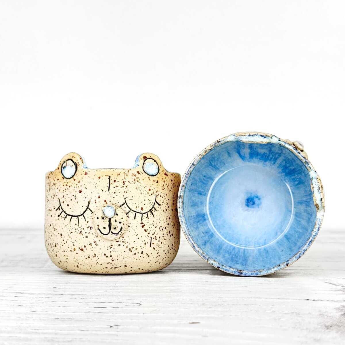 Tento kalíšek je ručně vytočen na hrnčířském kruhu z kvalitní pigmentované kameniny, ručně modelován a následně vypálen při vysokých teplotách v elektrické peci. Jemné odchylky v objemu, měřeném až po plný okraj, slouží jako orientační hodnota.