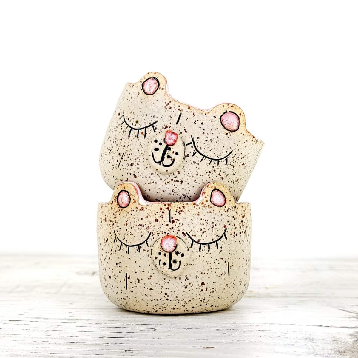 Tento kalíšek je ručně vytočen na hrnčířském kruhu z kvalitní pigmentované kameniny, ručně modelován a následně vypálen při vysokých teplotách v elektrické peci. Jemné odchylky v objemu, měřeném až po plný okraj, slouží jako orientační hodnota.