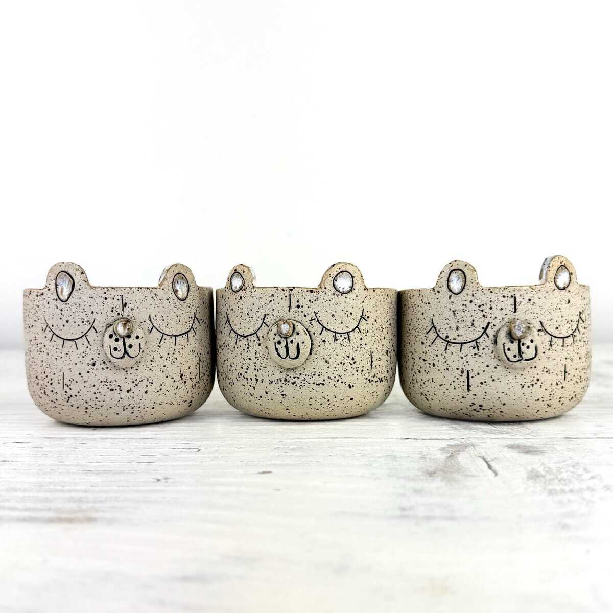 Tento kalíšek je ručně vytočen na hrnčířském kruhu z kvalitní pigmentované kameniny, ručně modelován a následně vypálen při vysokých teplotách v elektrické peci. Jemné odchylky v objemu, měřeném až po plný okraj, slouží jako orientační hodnota.