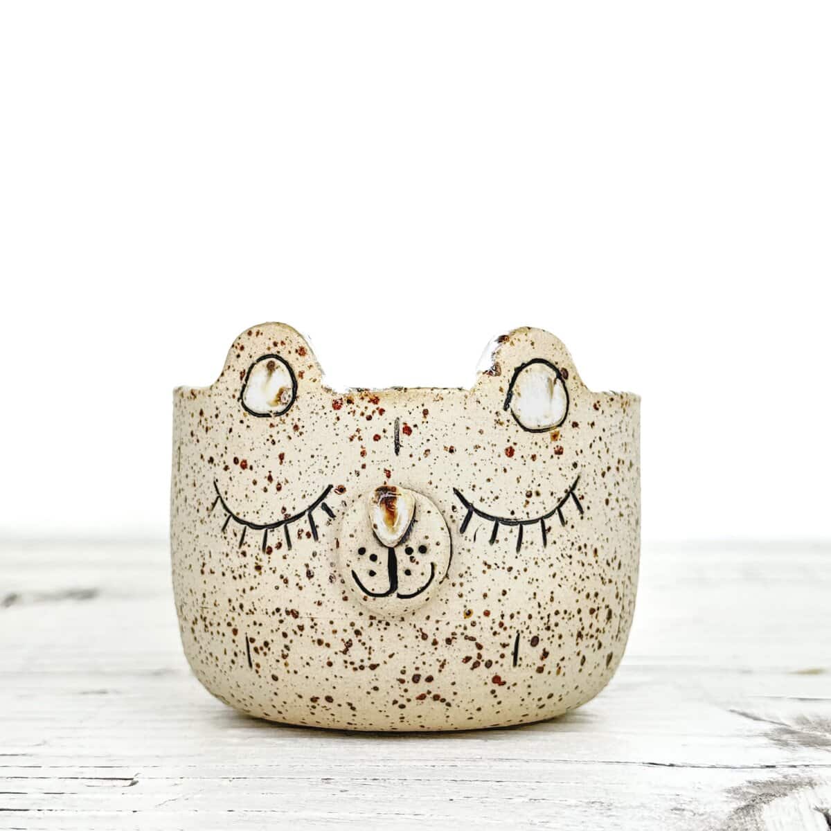 Tento kalíšek je ručně vytočen na hrnčířském kruhu z kvalitní pigmentované kameniny, ručně modelován a následně vypálen při vysokých teplotách v elektrické peci. Jemné odchylky v objemu, měřeném až po plný okraj, slouží jako orientační hodnota.