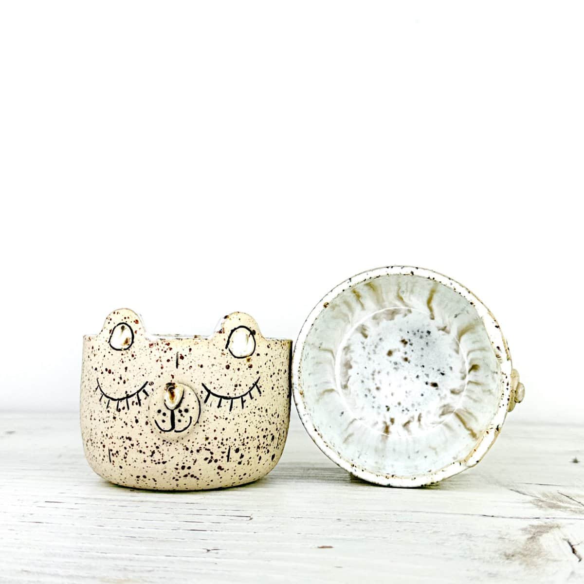 Tento kalíšek je ručně vytočen na hrnčířském kruhu z kvalitní pigmentované kameniny, ručně modelován a následně vypálen při vysokých teplotách v elektrické peci. Jemné odchylky v objemu, měřeném až po plný okraj, slouží jako orientační hodnota.