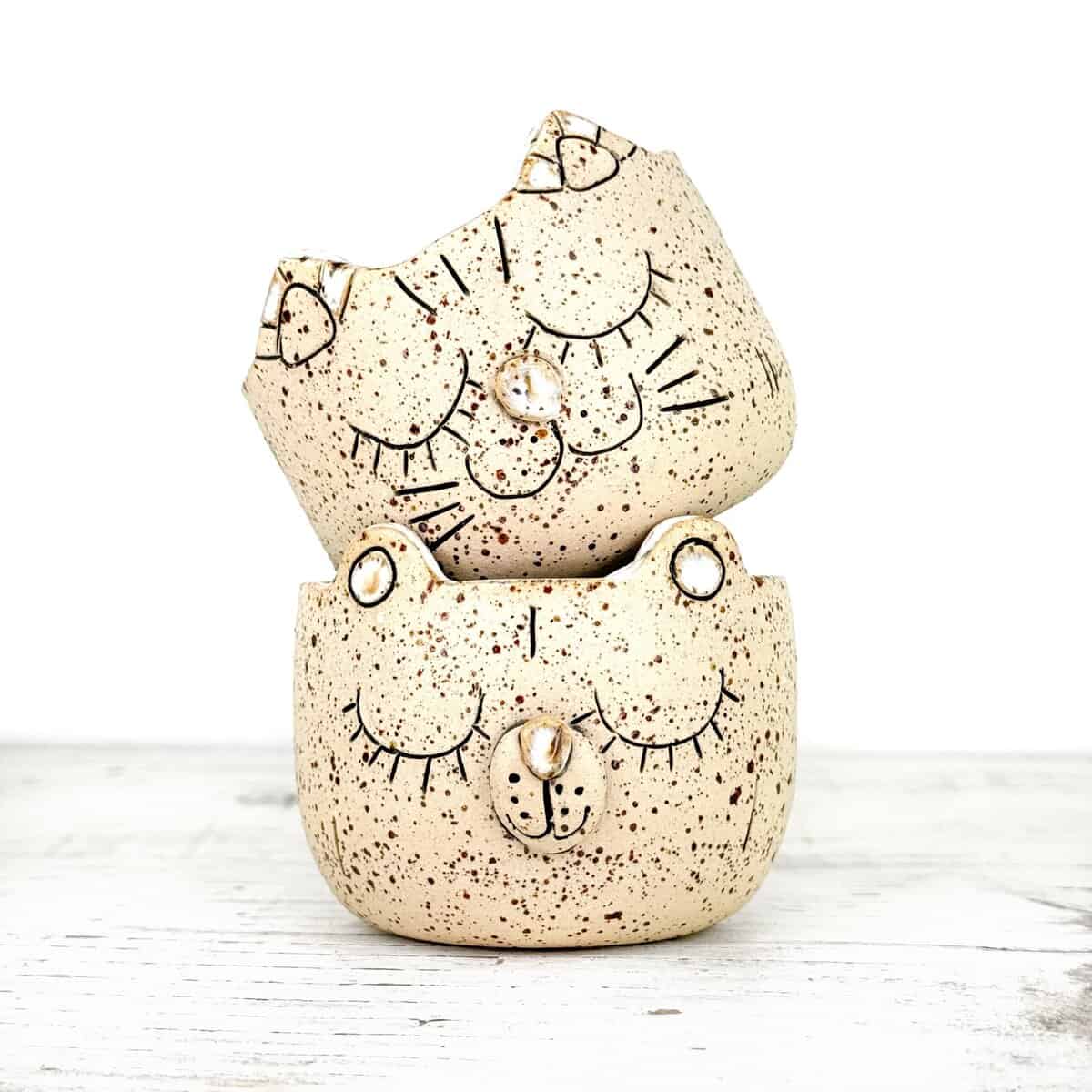 Tento kalíšek je ručně vytočen na hrnčířském kruhu z kvalitní pigmentované kameniny, ručně modelován a následně vypálen při vysokých teplotách v elektrické peci. Jemné odchylky v objemu, měřeném až po plný okraj, slouží jako orientační hodnota.