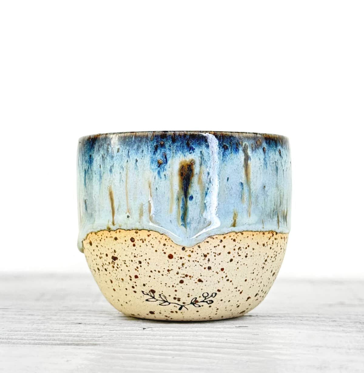 Tento kalíšek je ručně vytočen na hrnčířském kruhu z kvalitní pigmentované kameniny a následně vypálen při vysokých teplotách v elektrické peci. Jemné odchylky v objemu, měřeném až po plný okraj, slouží jako orientační hodnota.