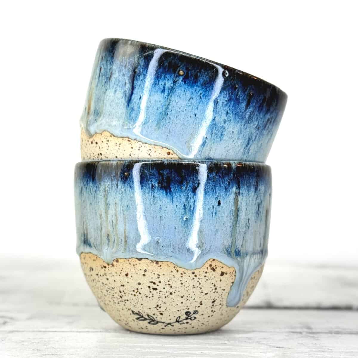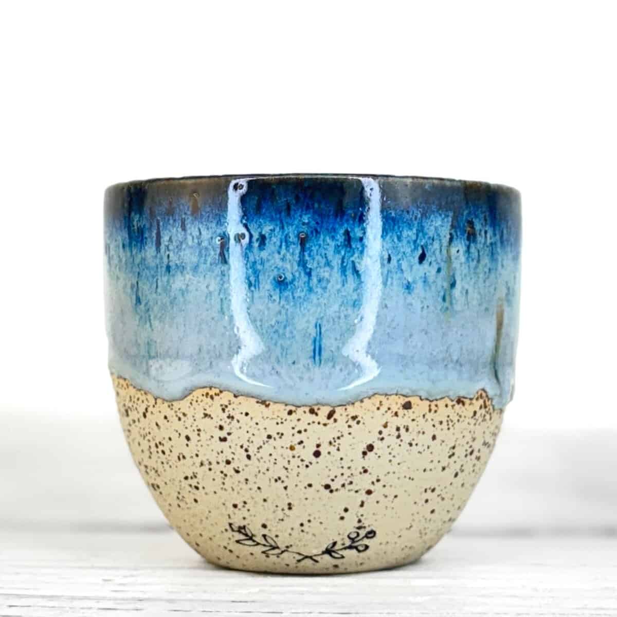 Tento kalíšek je ručně vytočený na hrnčířském kruhu z pigmentované kameniny a vypálený při vysokých teplotách v elektrické peci. Každý kus vzniká samostatně, bez forem a bez snahy o naprostou shodu. Drobné rozdíly v tvaru, tloušťce i povrchu jsou přirozenou součástí ruční práce.