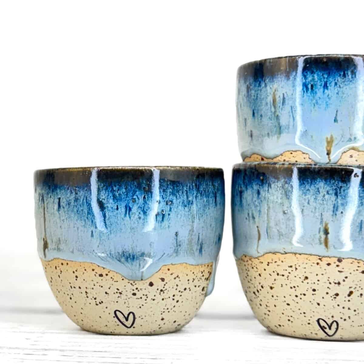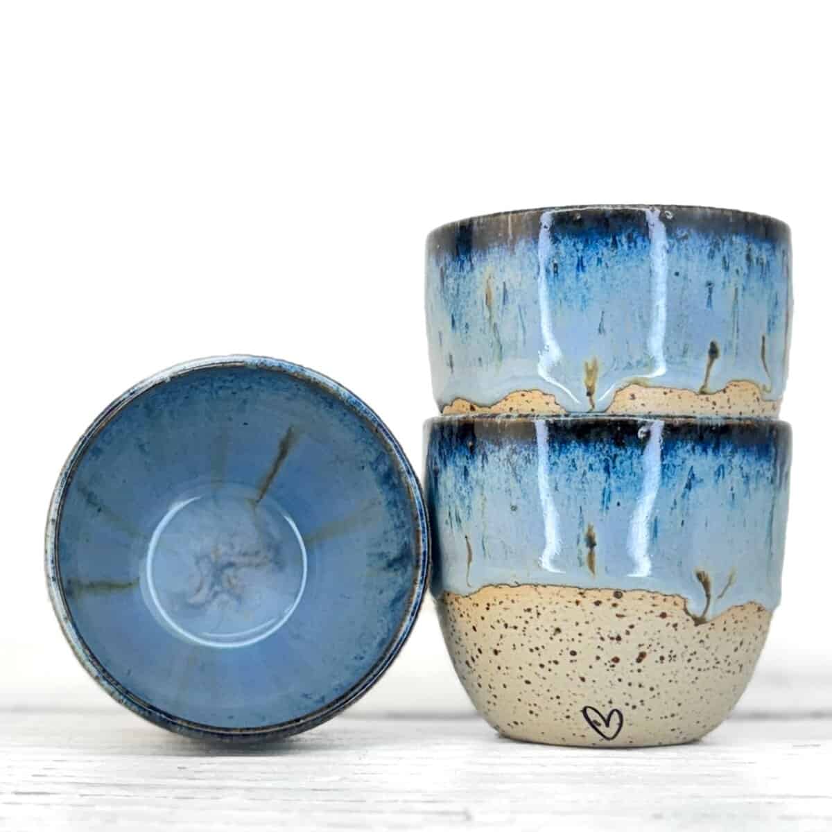 Tento kalíšek je ručně vytočený na hrnčířském kruhu z pigmentované kameniny a vypálený při vysokých teplotách v elektrické peci. Každý kus vzniká samostatně, bez forem a bez snahy o naprostou shodu. Drobné rozdíly v tvaru, tloušťce i povrchu jsou přirozenou součástí ruční práce.
