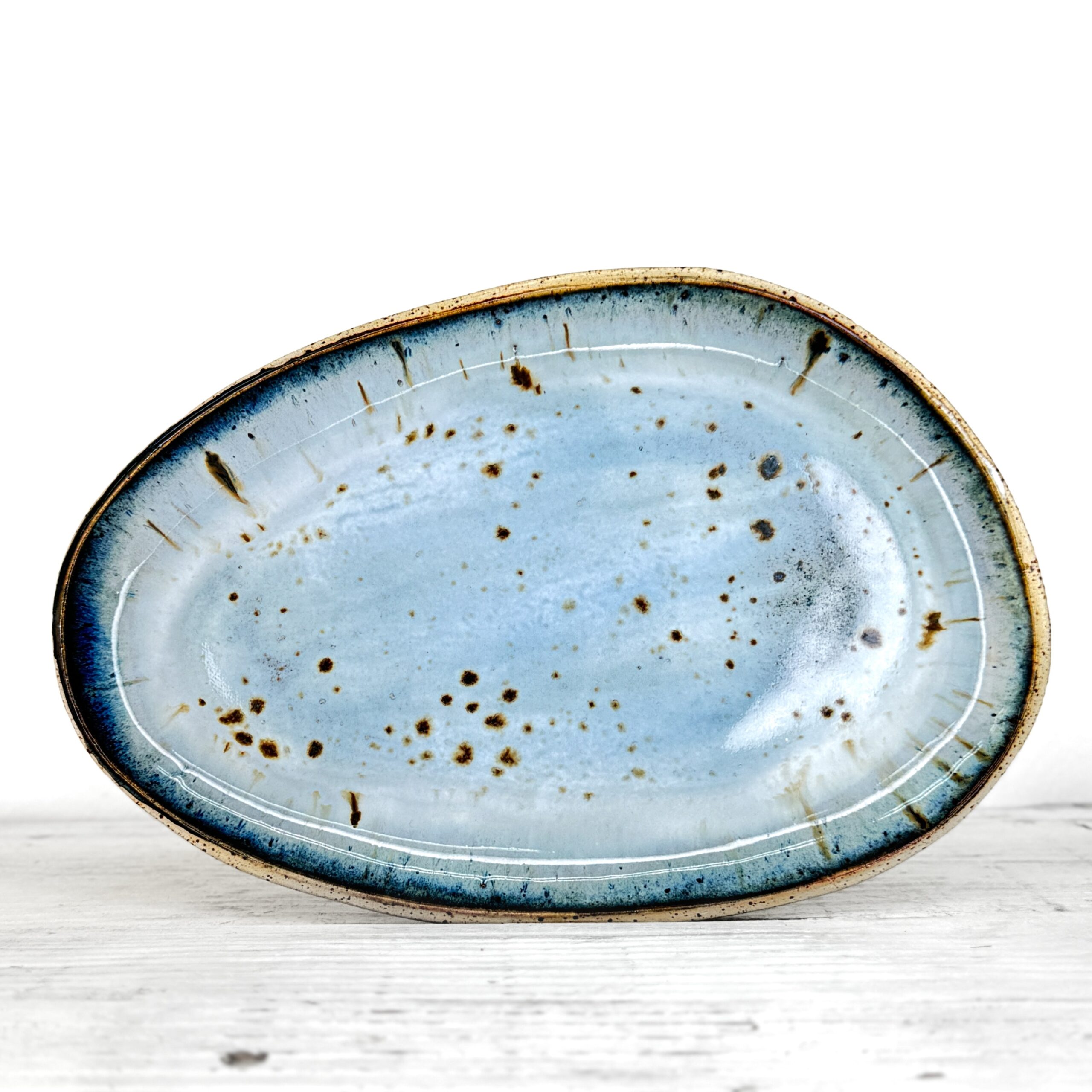 Tento talíř je ručně modelovaný z pigmentované kameniny a vypálený při vysokých teplotách v elektrické peci. Každý kus vzniká samostatně, bez forem a bez snahy o naprostou shodu. Drobné rozdíly v tvaru, tloušťce i povrchu jsou přirozenou součástí ruční práce.