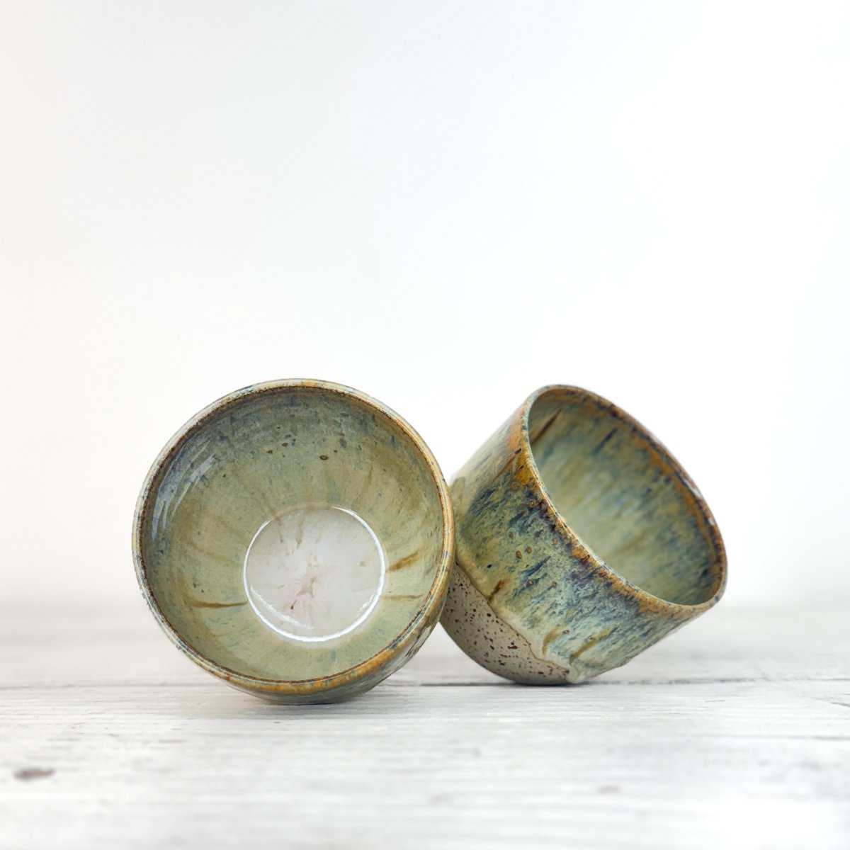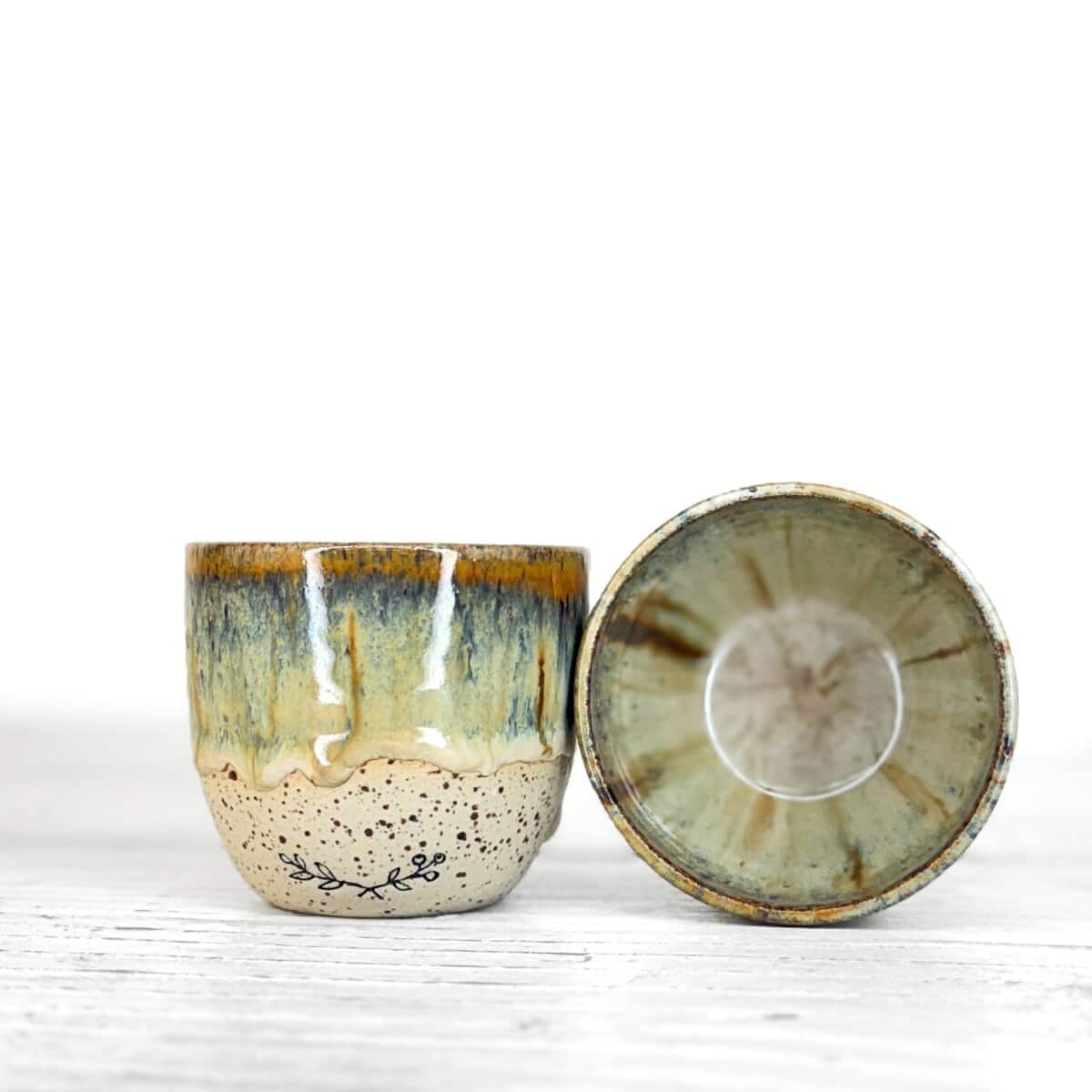 Tento kalíšek je ručně vytočený na hrnčířském kruhu z pigmentované kameniny a vypálený při vysokých teplotách v elektrické peci. Každý kus vzniká samostatně, bez forem a bez snahy o naprostou shodu. Drobné rozdíly v tvaru, tloušťce i povrchu jsou přirozenou součástí ruční práce.