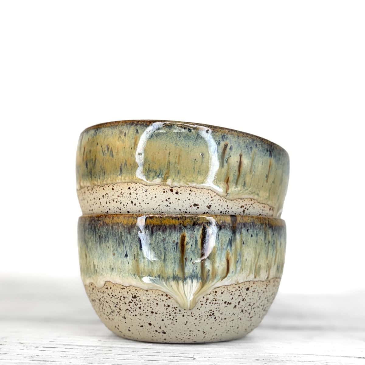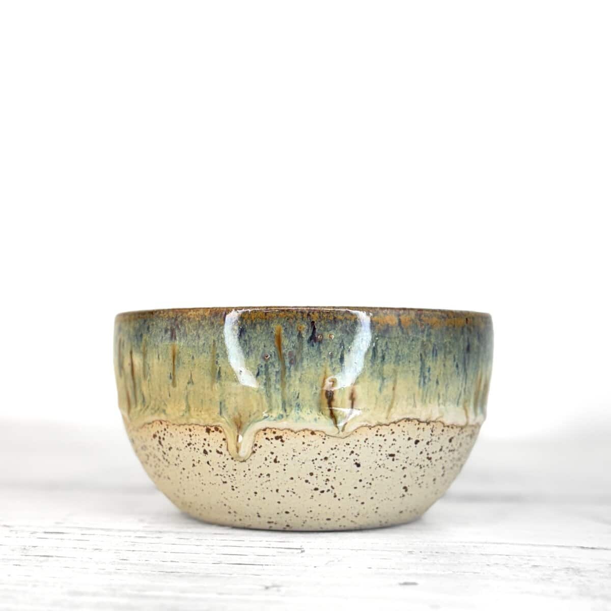 Povrch misky tvoří stékaná glazura, která se při každém výpalu chová trochu jinak. Někdy stéká výrazněji, jindy jemněji. Tyto rozdíly nejsou vadou, ale přirozeným výsledkem ruční práce a dělají z každé misky originál.