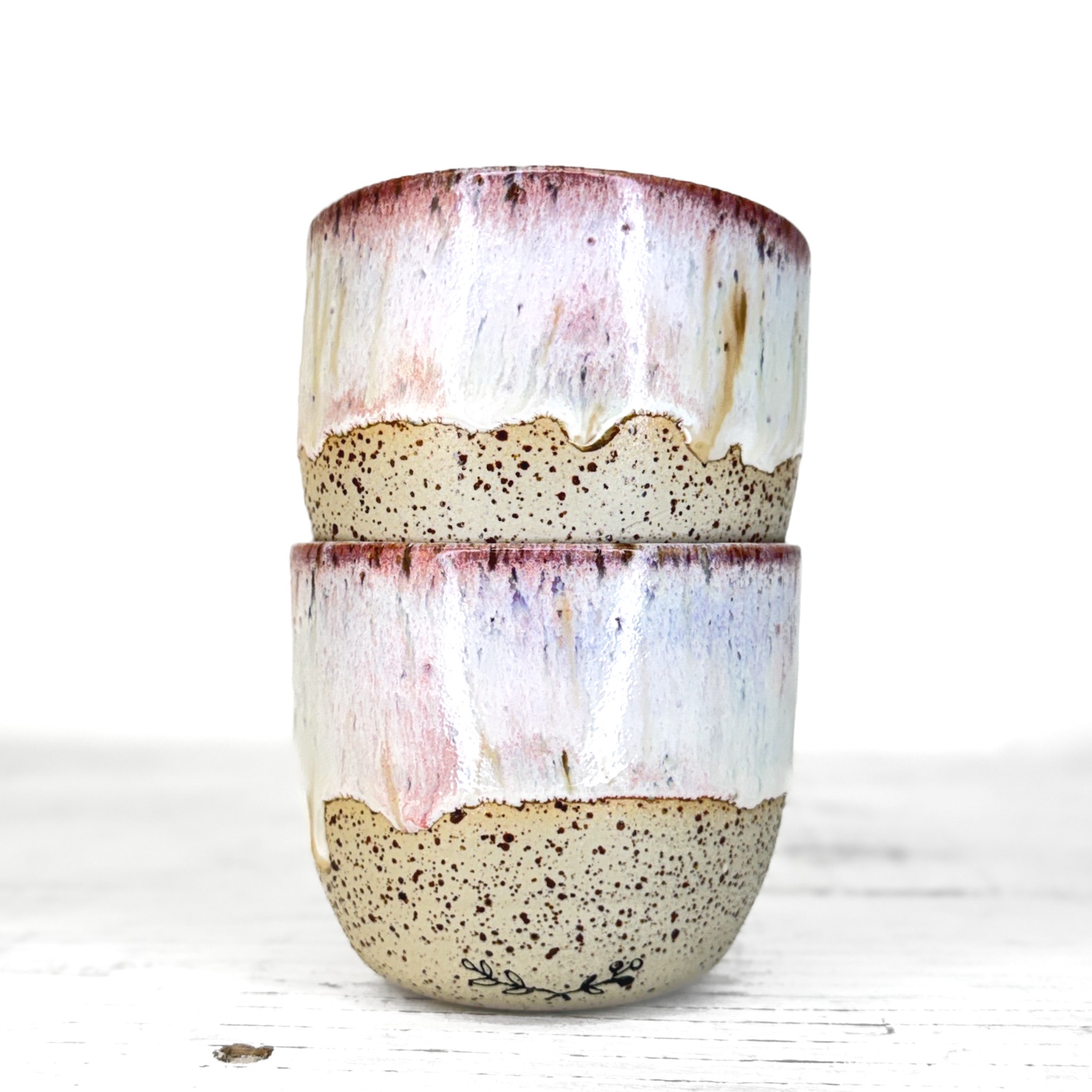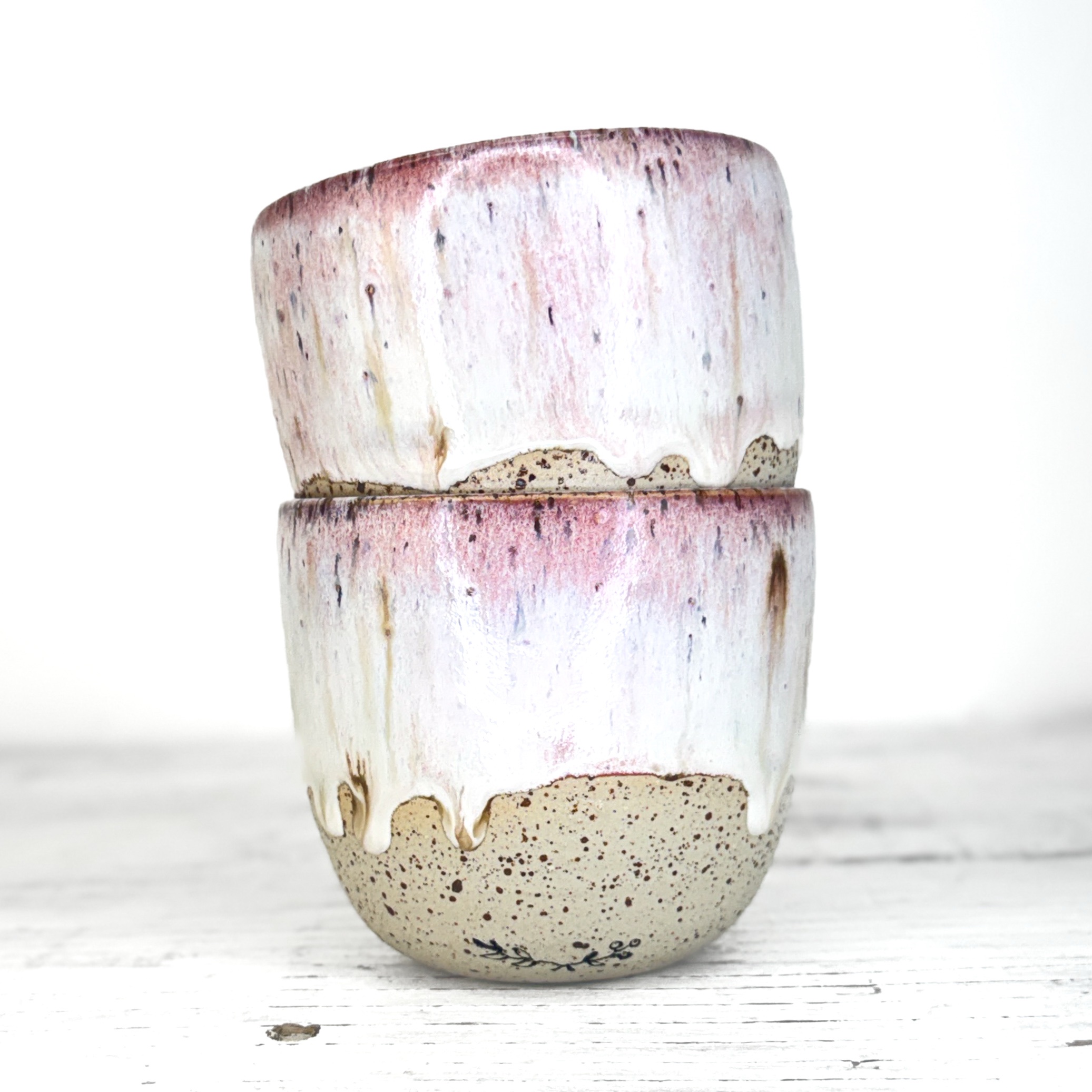 Tento kalíšek je ručně vytočený na hrnčířském kruhu z pigmentované kameniny a vypálený při vysokých teplotách v elektrické peci. Každý kus vzniká samostatně, bez forem a bez snahy o naprostou shodu. Drobné rozdíly v tvaru, tloušťce i povrchu jsou přirozenou součástí ruční práce.