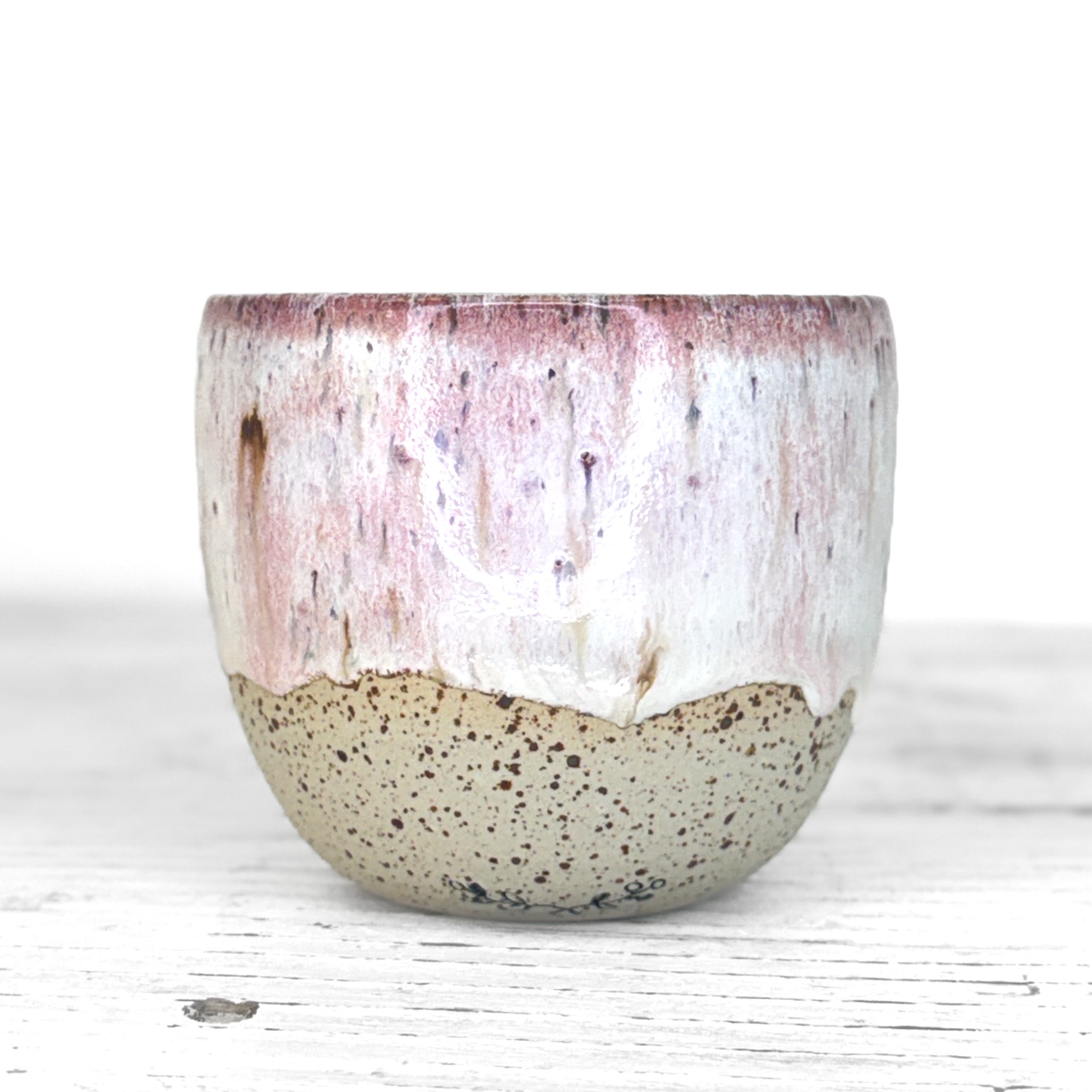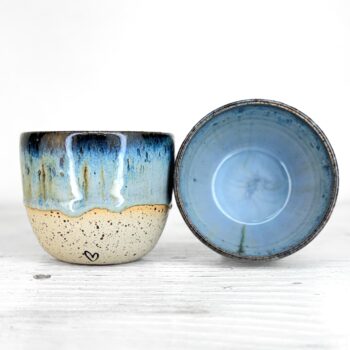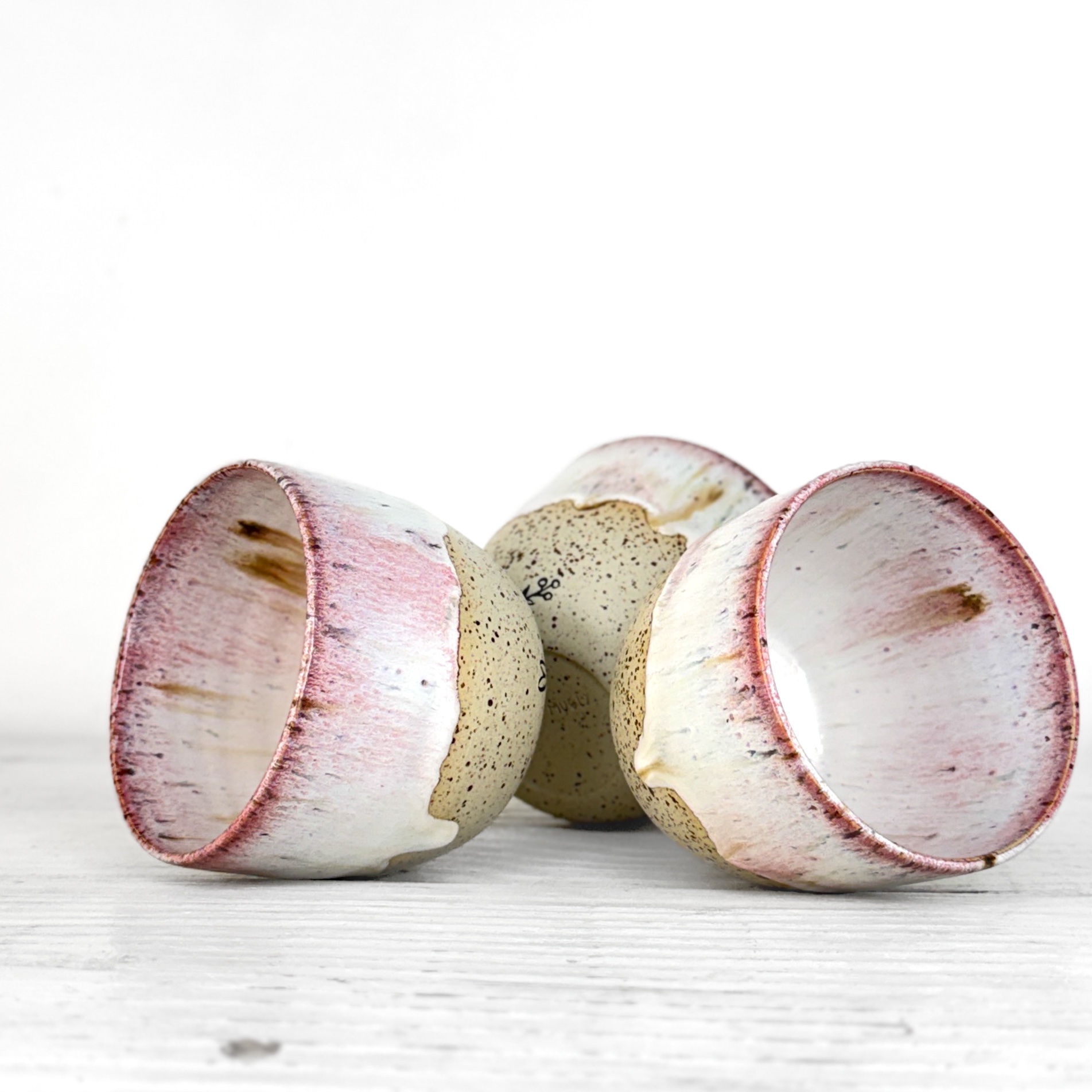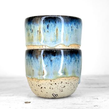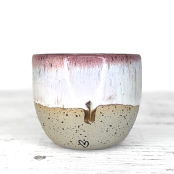 Tento kalíšek je ručně vytočený na hrnčířském kruhu z pigmentované kameniny a vypálený při vysokých teplotách v elektrické peci. Každý kus vzniká samostatně, bez forem a bez snahy o naprostou shodu. Drobné rozdíly v tvaru, tloušťce i povrchu jsou přirozenou součástí ruční práce.