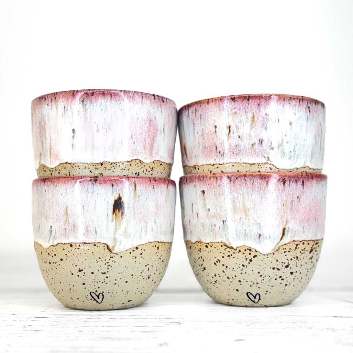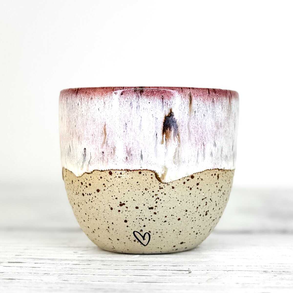 Tento kalíšek je ručně vytočený na hrnčířském kruhu z pigmentované kameniny a vypálený při vysokých teplotách v elektrické peci. Každý kus vzniká samostatně, bez forem a bez snahy o naprostou shodu. Drobné rozdíly v tvaru, tloušťce i povrchu jsou přirozenou součástí ruční práce.