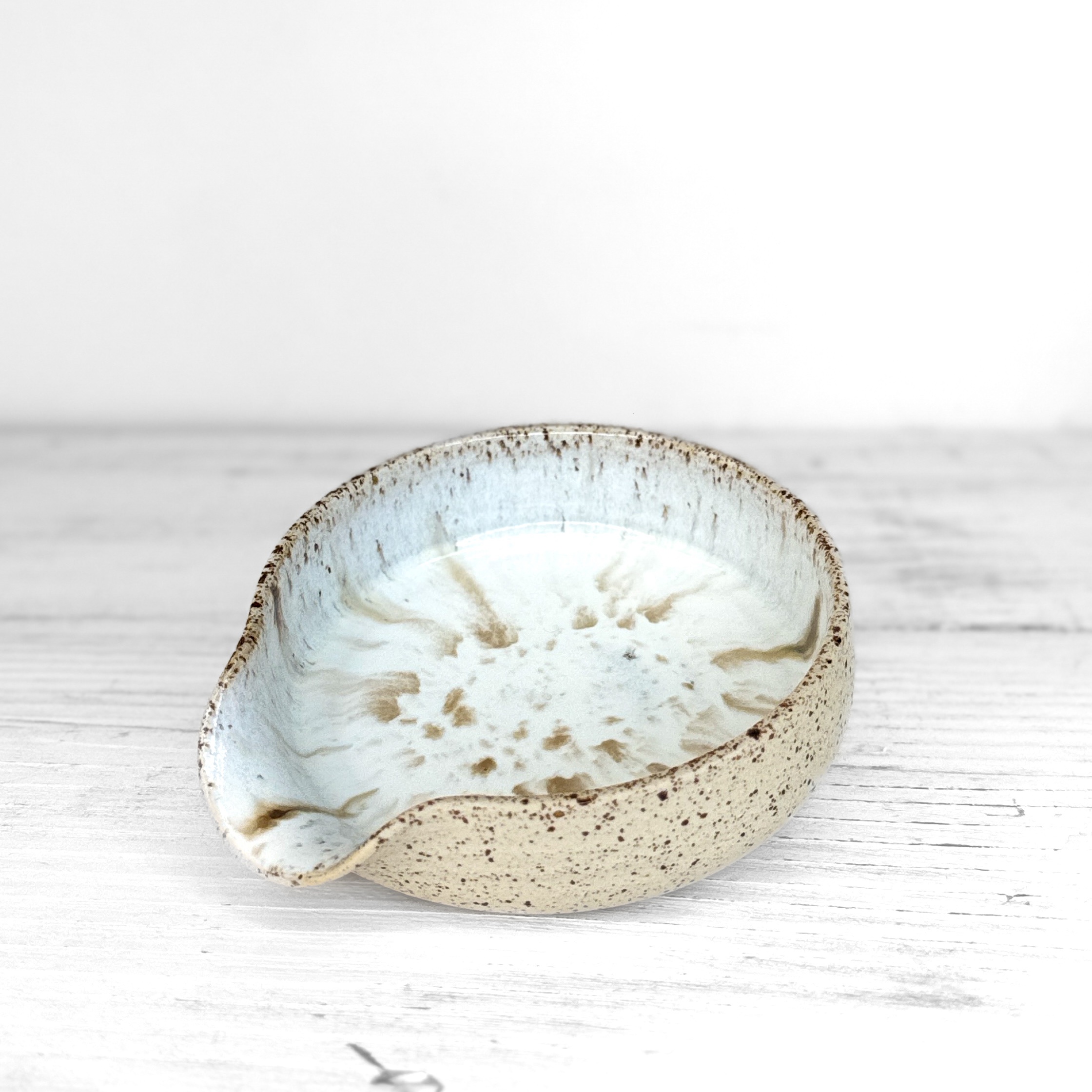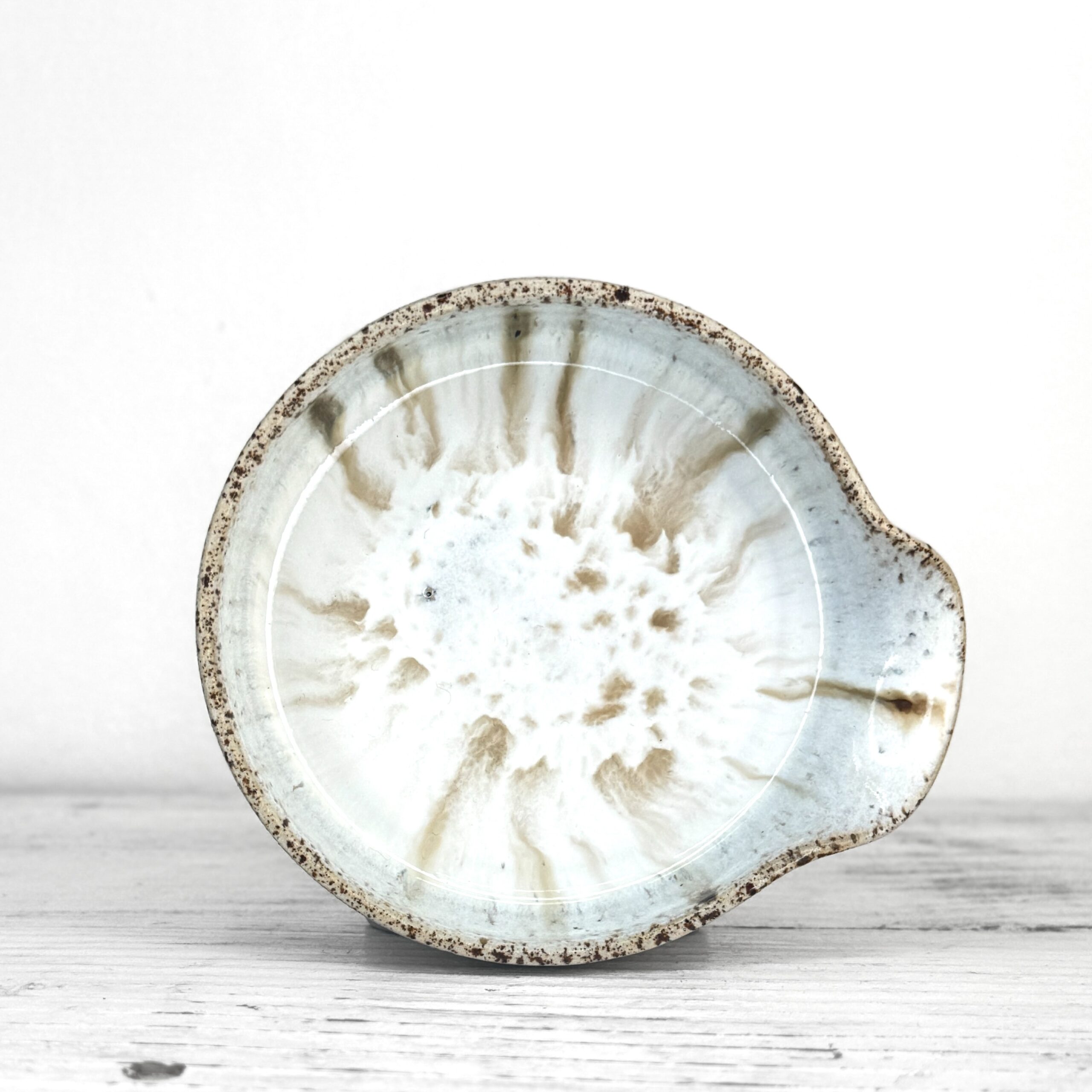 Tato miska slouží na odkládání kuchyňského náčiní při vaření, případně drobné servírování. Je ručně vytočená na hrnčířském kruhu z pigmentované kameniny a vypálená při vysokých teplotách v elektrické peci. Každý kus vzniká samostatně bez použití forem, proto se jednotlivé misky mohou mírně lišit v tvaru, tloušťce i celkovém výrazu.