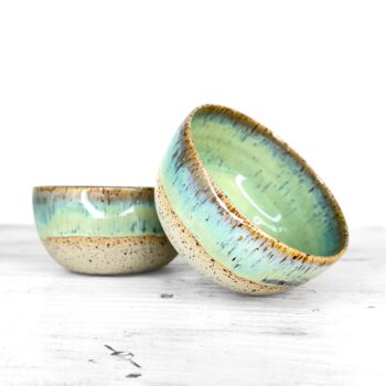 Vnitřek misky tvoří glazura, která se při každém výpalu chová trochu jinak. Tyto rozdíly nejsou vadou, ale přirozeným výsledkem ruční práce a dělají z každé misky originál.